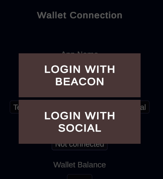 These UI elements call the Wallet.Connect() method with the walletProvider parameter set to WalletProviderType.beacon for the direct links or QR code connections and the walletProvider parameter set to WalletProviderType.kukai for the social wallet connections.